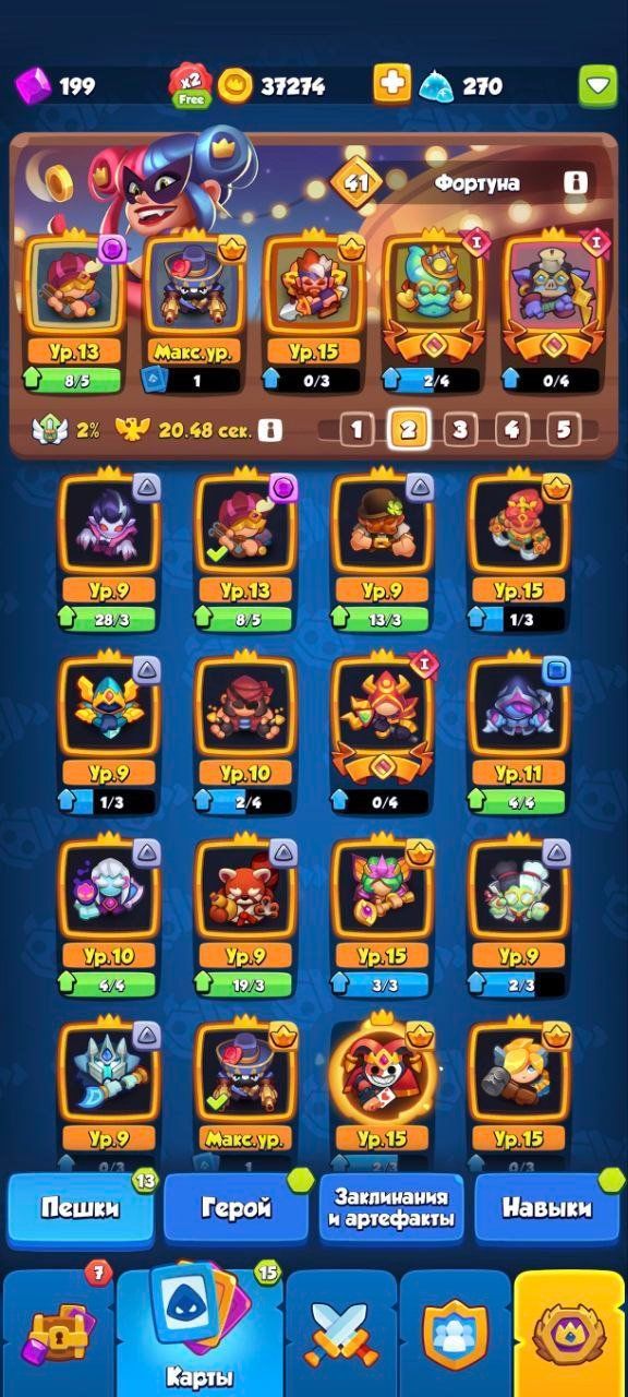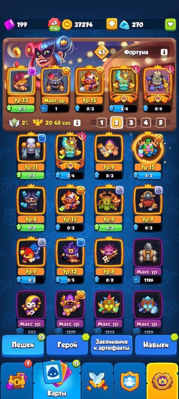 Account contains 80s epics, 40k legendaries, heroes Archer, Djinn, Kobold Reborn. Top deck of the season with Firefang. Pictures show level 99 account with 23236 rating, 290-240 trophies, multiple champions at levels 21-31 including music sp, various fragments chests 1300+, coins 25k, gems 600, new tournaments, arena, clan. Epic fragments 13k, star fragments 16k, diamond fragments 10k, ruby fragments 20k, sapphire fragments 25k, tournament coins 1170 1295 500 1465 940. Tournament tickets 1000 4000 10000. Multiple champions like orange dress, music sp, purple dragon, green frog, orange fox, many more at levels 11-31. Heroes fragments 37 levels 1-4. No other text visible in pictures.