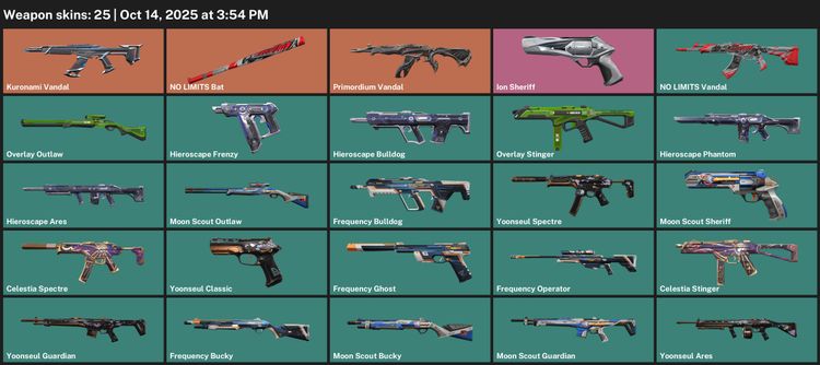 Includes 25 weapon skins: Kuronami Vandal, NO LIMITS Bat, Primordium Vandal, Ion Sheriff, NO LIMITS Vandal, Overlay Outlaw, Hieroscape Frenzy, Hieroscape Bulldog, Overlay Stinger, Hieroscape Phantom, Hieroscape Ares, Moon Scout Outlaw, Frequency Bulldog, Yoonseul Spectre, Moon Scout Sheriff, Celestia Spectre, Yoonseul Classic, Frequency Ghost, Frequency Operator, Celestia Stinger, Yoonseul Guardian, Frequency Bucky, Moon Scout Bucky, Moon Scout Guardian, Yoonseul Ares. Contains 25 buddies such as V25A3: Bronze Buddy, Pocket Jett Buddy, Celestia Buddy, VALORANT Coin Buddy, Hot New Engine Buddy, Prize Size KAY/O Buddy, Scaredy Cow Buddy, Ep 9 // 2 Coin Buddy, Spoonful Buddy, Smite Knife Buddy, Space Out Homie Buddy, Lava Lamp Buddy, Sneaky Kitty Buddy, Frequency Buddy, Ep 9 // 1 Coin Buddy, Laser Blaster Buddy, Overlay Buddy, Hieroscape Buddy, Yoonseul Buddy, V25 ACT II Coin Buddy, Ep 8 // 3 Coin Buddy, V25 ACT IV Coin Buddy, V25 ACT V Coin Buddy, V25 ACT I Coin Buddy, Lethal Dose Buddy. Has 10 agents: Clove, Iso, Omen, Reyna, Waylay, Neon, Yoru, Raze, Chamber, Vyse. Skin quantity: 25. Agent quantity: 10. Required Info Numbers: Server: EU Current Rank: Bronze 1 Agents: 10 Skins Amount: 25 Level: 37 Valorant Points: 284 Radianite Points: 200