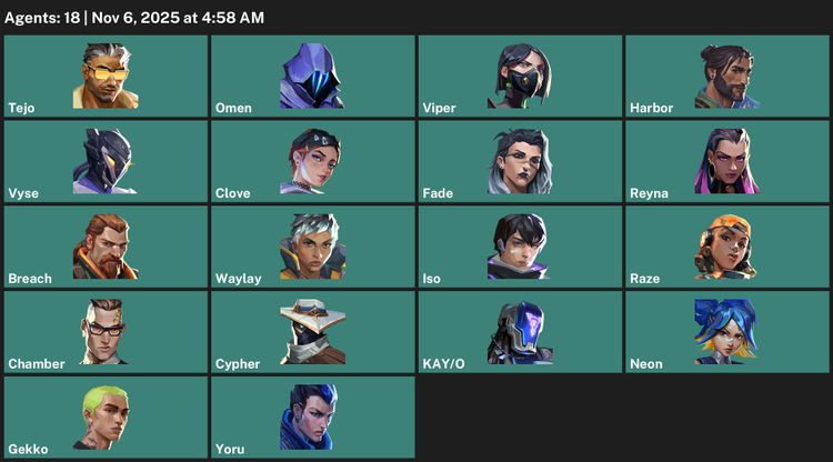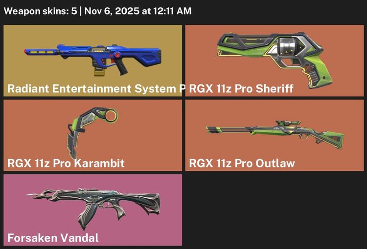 Contains 18 unlocked agents: Tejo, Omen, Viper, Harbor, Vyse, Clove, Fade, Reyna, Breach, Waylay, Iso, Raze, Chamber, Cypher, KAY/O, Neon, Gekko, Yoru. 5 weapon skins: RGX 11z Pro Karambit, RGX 11z Pro Sheriff, RGX 11z Pro Outlaw, Forsaken Vandal, Radiant Entertainment System Phantom. Includes 39 buddies, such as Fortune Paws, Lethal Dose, VALORANT Coin, Lava Lamp, Beta Key, Pride, Happy Dumpling, Pocket Jett, Arcane Cupcake, Spoonful, and more. Level 60, last rank Gold 1, EU server. Valorant Points: 25, Radianite Points: 160. Info Numbers Server: EU Current Rank: Gold 1 (last rank) Agents: 18 Skins Amount: 5 Level: 60 Valorant Points: 25 Radianite Points: 160