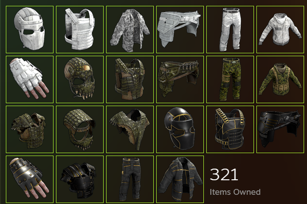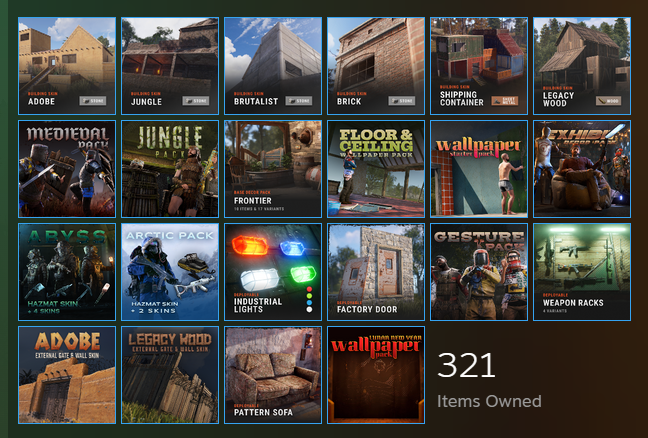 Contains 321 unique items, including premium armor and cosmetic skins such as white and camouflage gear sets, tactical helmets, gloves, chest plates, and advanced leg/torso sets. Features large collections of building skins and decor packs: Adobe, Jungle, Brutalist, Brick, Shipping Container, Legacy Wood, Pattern Sofa, Medieval Pack, Abyss Hazmat, Arctic Pack, Industrial Lights, Gesture Pack, Weapon Racks, Floor & Ceiling, Frontier, and more, as visible in the showcase image. Steam account includes badges, profile XP, and access to exclusive packs. Information numbers: Platform: PC Server: Global Total Inventory: 321