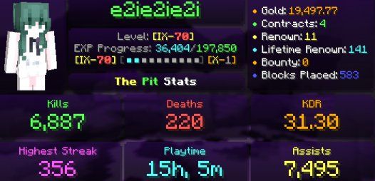 Level IX-70 9 Pit Prestige 6,887 kills 220 deaths 31.30 KDR 356 highest streak 7,495 assists 19,497.77 gold 4 contracts 11 renown 141 lifetime renown 0 bounty 583 blocks placed 15h 5m playtime Account Info Numbers: Hypixel Rank: VIP Server: Hypixel We offer a wide variety of game accounts, so if you’re looking for something specific, feel free to contact us. Have any questions? Don’t hesitate to message us!