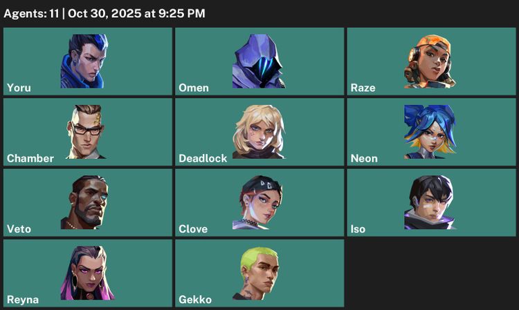 Account contains 16 weapon skins: Neo Frontier Sheriff, EXO Vandal, Equilibrium, Forsaken Vandal, Composite Marshal, Composite Stinger, Interhelm Classic, Composite Phantom, Composite Sheriff, Digihex Bulldog, Blush Operator, Digihex Judge, Blush Frenzy, Digihex Ares, Blush Guardian, Blush Spectre. Includes 21 buddies such as Penguin Surprise Buddy, Blush Buddy, Composite Buddy, Ep 7 // 3 Coin Buddy, Ep 8 // 3 Coin Buddy, Digihex Buddy, Lethal Dose Buddy, Robotic Companion Buddy, Duck Chillin' Buddy, and more. There are 11 unlocked agents: Yoru, Omen, Raze, Chamber, Deadlock, Neon, Veto, Clove, Iso, Reyna, Gekko. Region is EU, Account Level is 47, and last rank was Platinum 1. VP: 170, RP: 55. Info Numbers Server: EU Current Rank: Platinum 1 Agents: 11 Skins Amount: 16 Level: 47 Valorant Points: 170 Radianite Points: 55