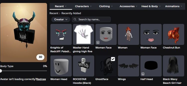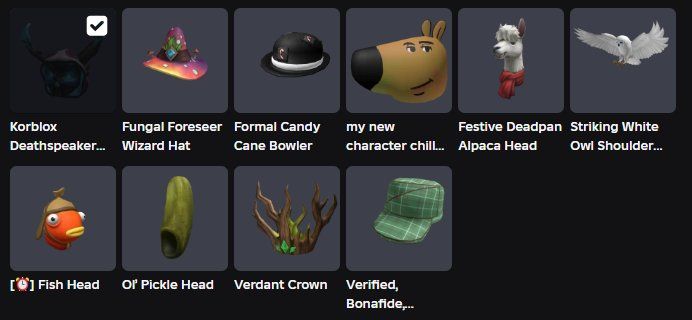 Includes Korblox Deathspeaker, Fungal Foreseer Wizard Hat, Formal Candy Cane Bowler, Fish Head, Verdant Crown, Ghostface, Festive Deadpan Alpaca Head, Striking White Owl Shoulder, Ol' Pickle Head, Verified Bonafide Cap, my new character chill, Master Hand giving high five, Knights of Redcliff Paladin, Woman Face, Wings, Chestnut Bun, Black Wavy Beach Girl Hair, Black and Blue Cool Messy Boy Hair, Wavy Full Messy Boy Hair (Black), Black To Red Fluffy Middle, Short and Sleek Blonde, Brown Hair, Brown Charmer, Blonde Spiked, Pal Hair, Woman, ROBLOX Girl, Man, ROBLOX Boy, Rockstar Hoodie (Black), Half Head. Also contains VIP from Adopt Me with access to exclusive house and car. Hair accessories collection includes Chestnut Bun, Black Wavy Beach Girl Hair, Black and Blue Cool Messy Boy Hair, Wavy Full Messy Boy Hair (Black), Black To Red Fluffy Middle, Short and Sleek Blonde, Brown Hair, Brown Charmer, Blonde Spiked, Pal Hair. Playable faces include Woman Face, Woman Head, Ghostface mask, and others.